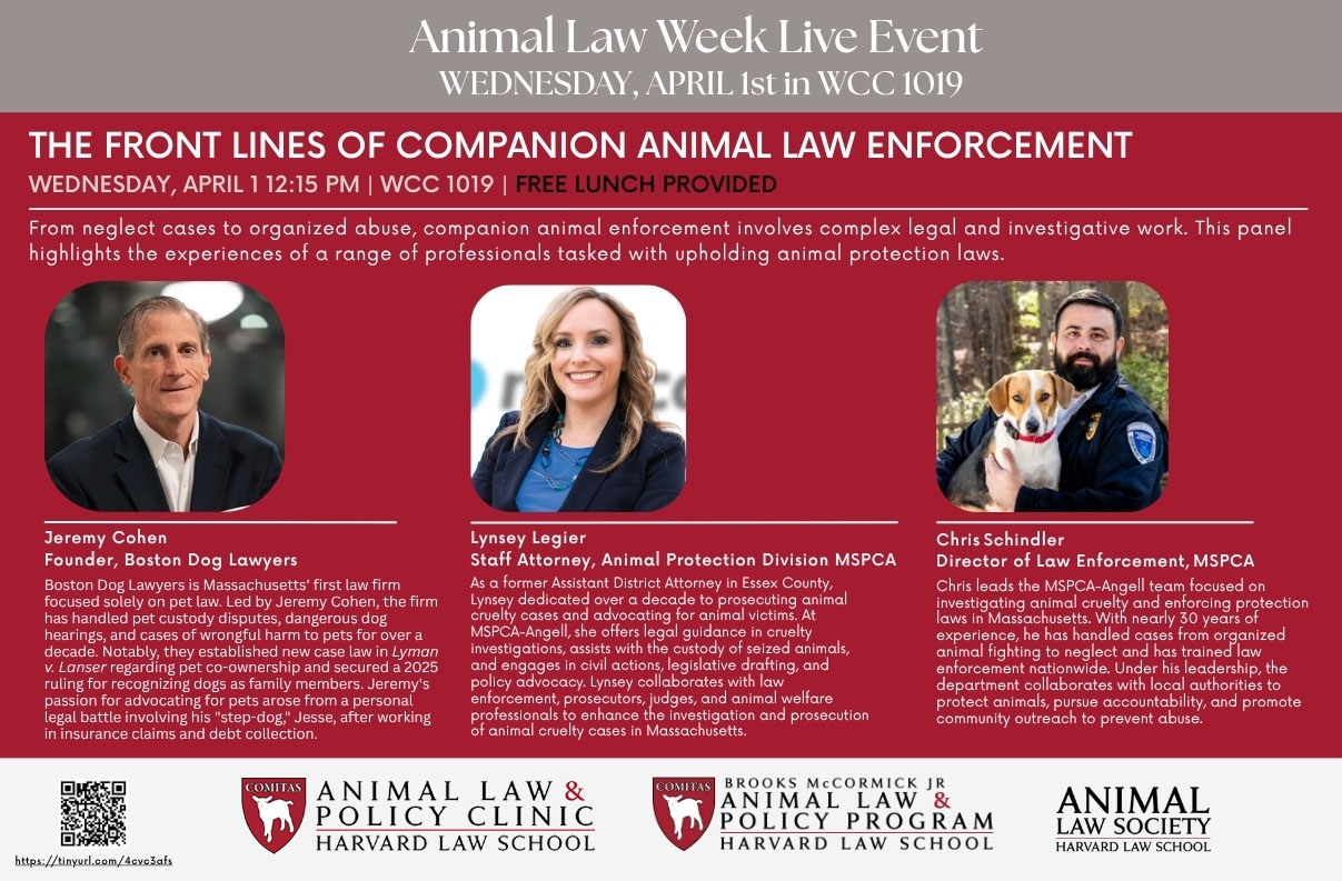 From cruelty investigations to dangerous dog proceedings, what does it take to enforce companion animal protection laws? This panel offers a behind-the-scenes look at how these emotional and complex cases are built. Hear from three distinct perspectives on the front lines: Chris Schindler, Director of Law Enforcement at the MSPCA, who leads on-the-ground investigations; Lynsey Legier, a Staff Attorney with the MSPCA’s Animal Protection Division, who handles the resulting legal actions; and Jeremy Cohen, founder of Boston Dog Lawyers, a private firm specializing in these unique cases.