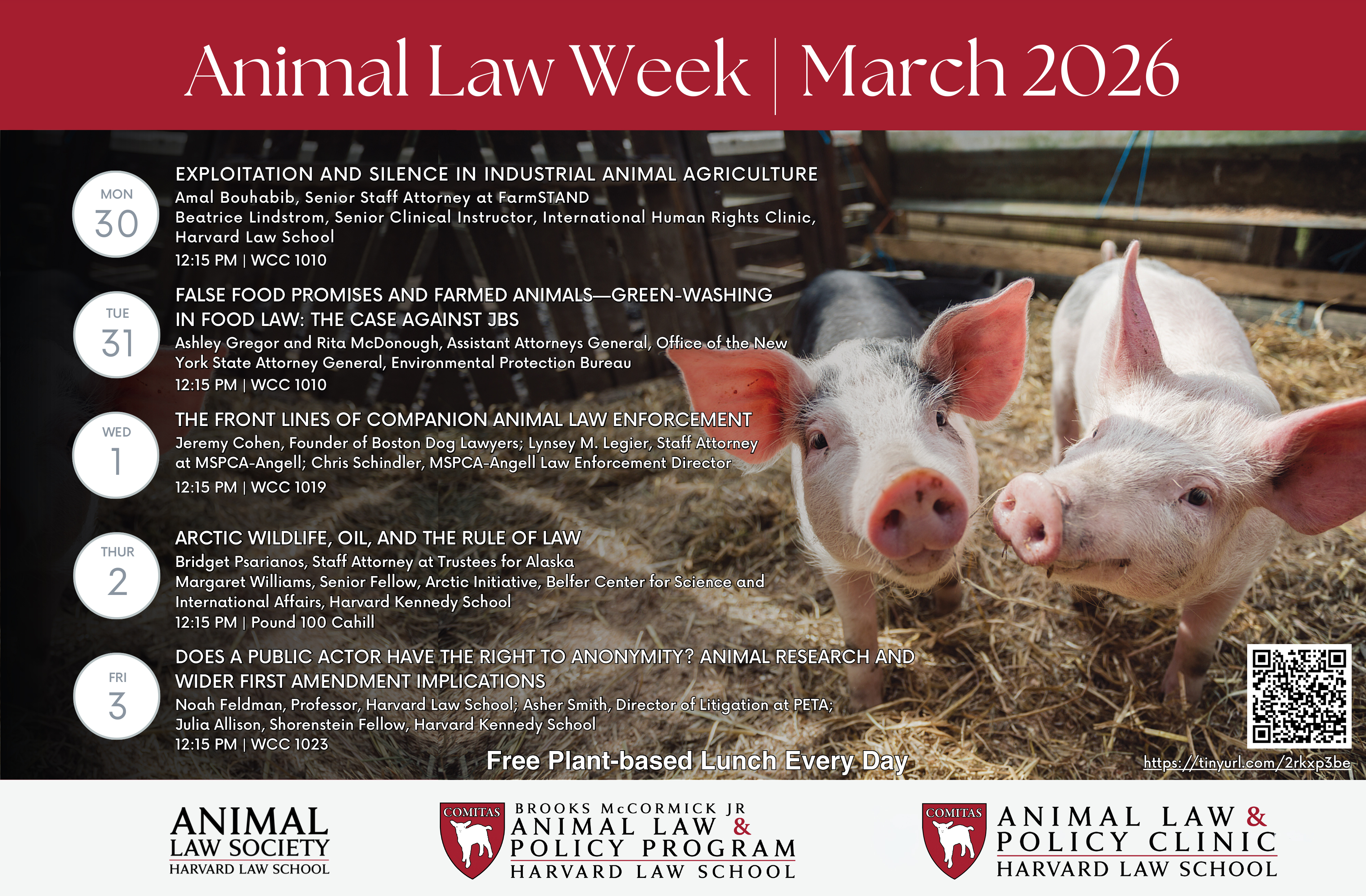 Animal Law Week returns with five days of timely, provocative conversations at the cutting edge of animal law and policy, and five days of free and delicious vegan lunches. This year’s program brings together litigators from across the country to explore the evolving intersection of animal welfare, human rights, and constitutional law. We welcome students, faculty, practitioners, and the broader legal community. Whether you’re new to and curious about animal law or deeply engaged in the field, join us for a week of dialogue. Each event takes place from 12:15–1:15pm.